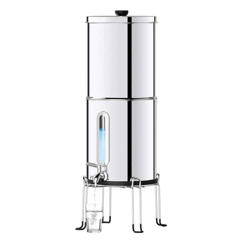 Filtre compact en inox avec indicateur visuel du niveau d’eau, pratique pour un usage domestique, camping-car ou sortie nature.